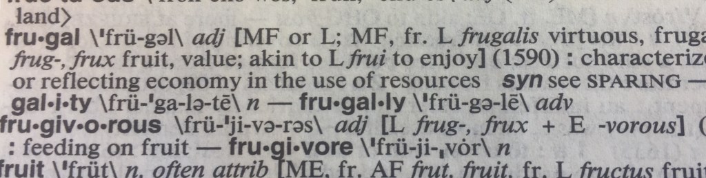 The Webster’s Dictionary defines frugal as an adjective derived from the French meaning virtuous and from Latin to enjoy. Around 1590 it began to define characteristics or reflecting economy in the use of resources. I think a lot about being virtuous but I never really thought about being frugal as a virtue. I think it really is a virtue to have and I’ve managed to lose sight of the virtue of ‘being frugal.’