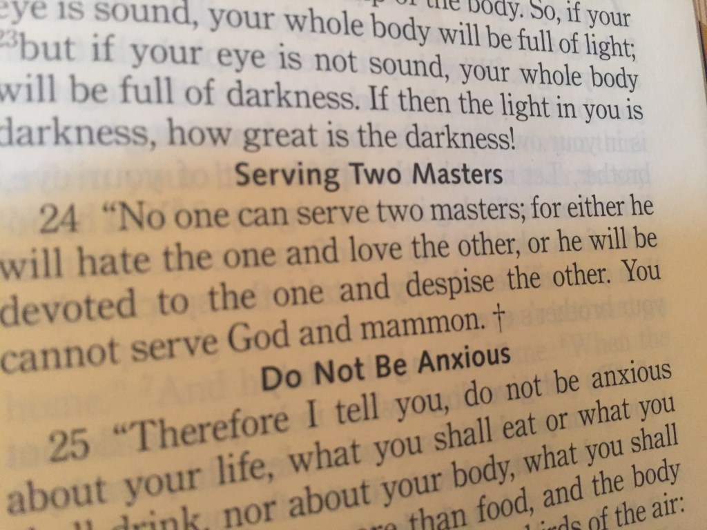 “…for either he will hate the one and love the other, or he will be devoted to the one and despise the other. You cannot serve God and mammon.”